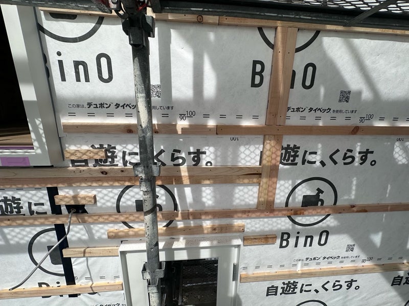外部では外壁材の下地となる通気胴縁を施工しています。来週は外部の防水シートの監査を行い、半ば頃から外壁材本体を貼り始める予定です。どんな外壁が貼られるのか楽しみにしていてください!