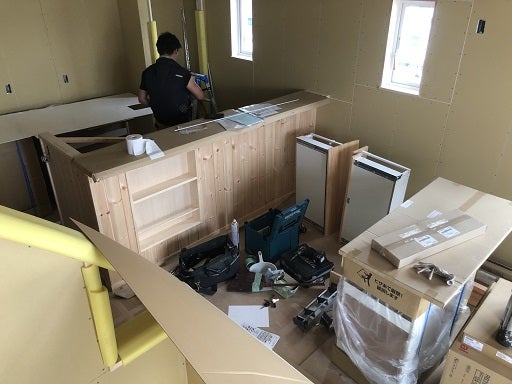内部も外部も工事は順調に進んでいます。内部では木工事と並行してキッチン設備の取付工事をおこないました。