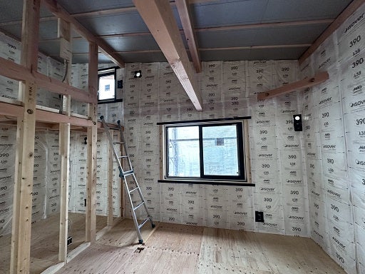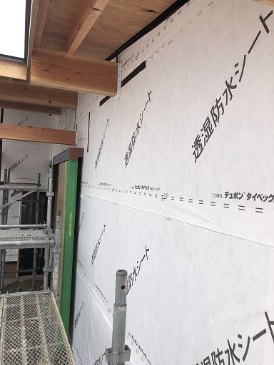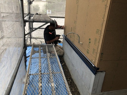 内部も外部も工事は順調に進んでいます。構造躯体検査に合格し、外部では透湿防水シートの施工を進めました。まずは土台水切りの取付からです。