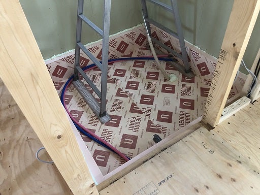 ユニットバスの施工を明日に控え基礎部分の断熱材施工や壁のプラスターボード張りも進めています。