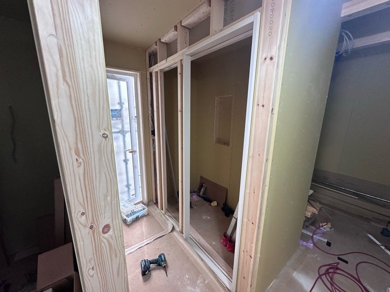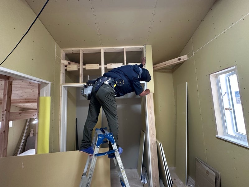 先週に引き続き、壁のボード貼りと建具枠の取り付けを進めています。2階の方から作業を進めていて、来週末くらいには2階のボード貼りは終わりそうです。