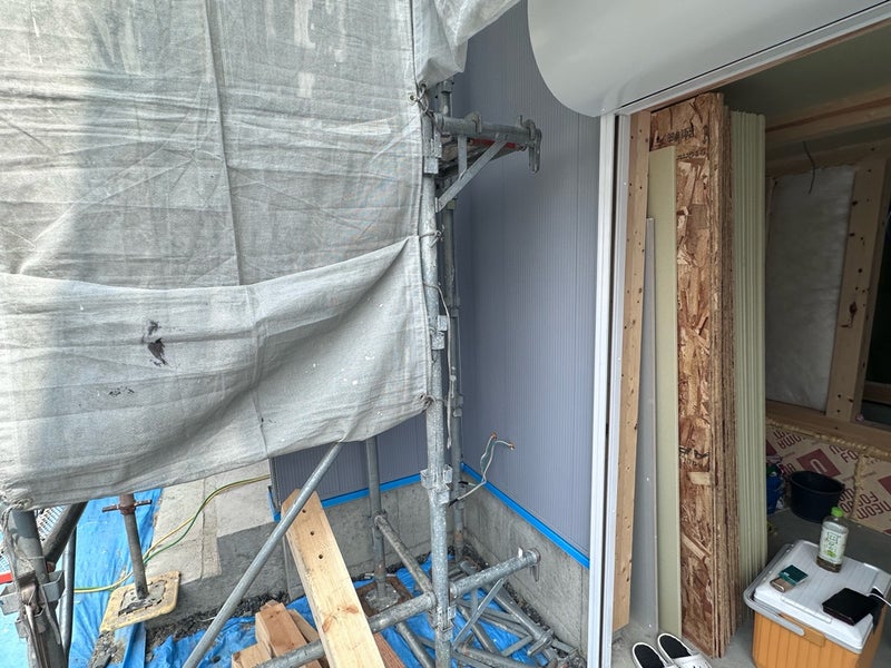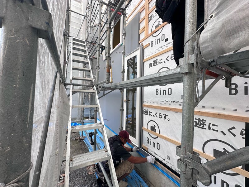 外壁材の施工も始まりました。ライトアッシュのガルバリウムサイディングです。早く足場を外して全体の外観を見たいですね。