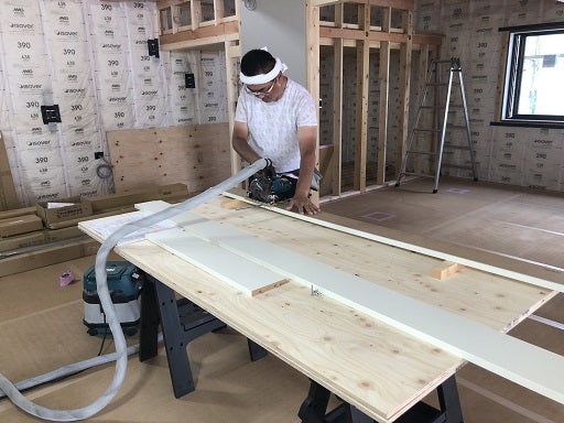 一面に床が貼られました。とてもかっこいいです。床貼り終了後棟梁は窓枠の取付を進め、