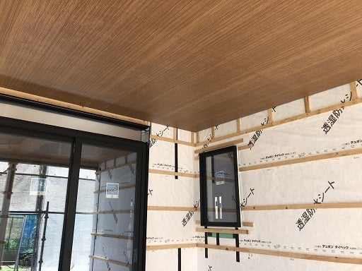 外部では、軒天張り工事が終了し、