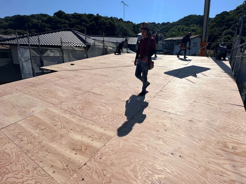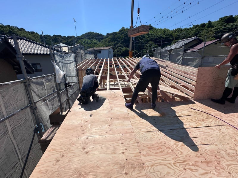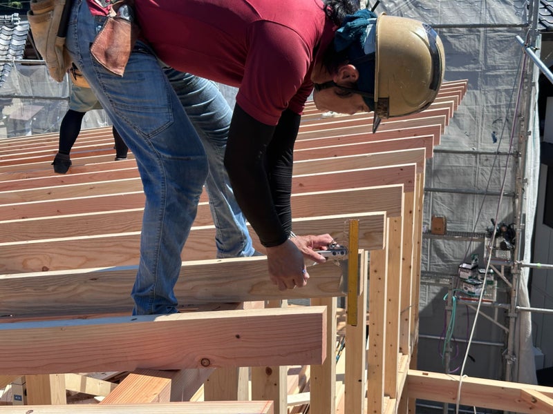 徐々に日が傾き、終盤にさしかかってきました。長時間の屋根組みも、終わりが見えてきます(*^^*)