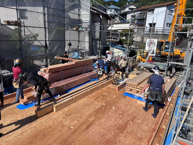 みるみるうちに、柱が立っていきます。朝一番、大工さん達のやる気がみなぎっています