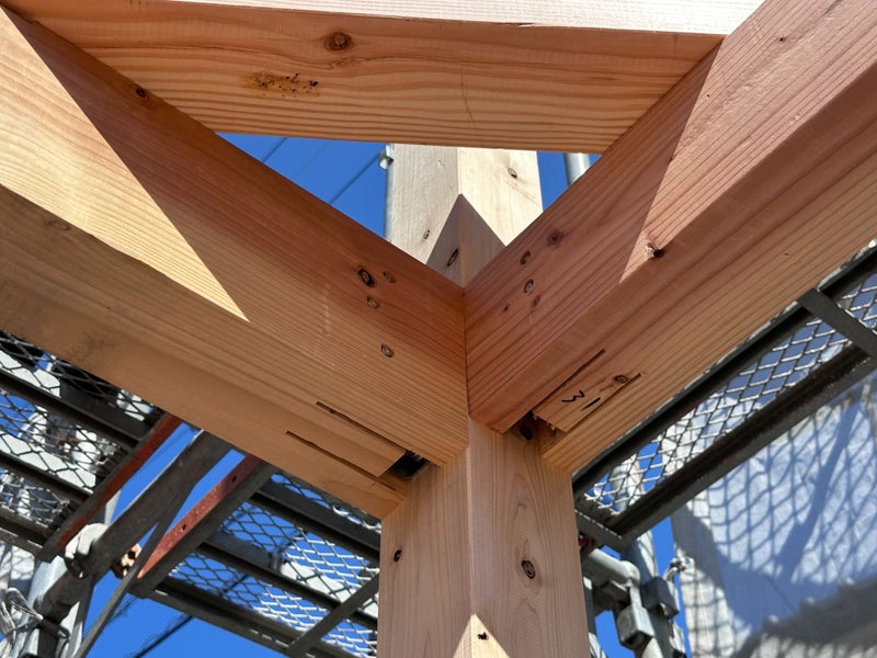 柱が並んだ通りから、梁も据えていきます。