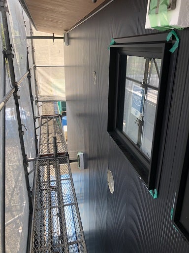 一枚一枚採寸し加工し丁寧に張っていきます。黒のサッシ色に黒の外壁材、軒天の木目調の色合いがバッチリ合い、とてもかっこいいです。この後も施工を進めていきます。S様、楽しみにしていてくださいね!