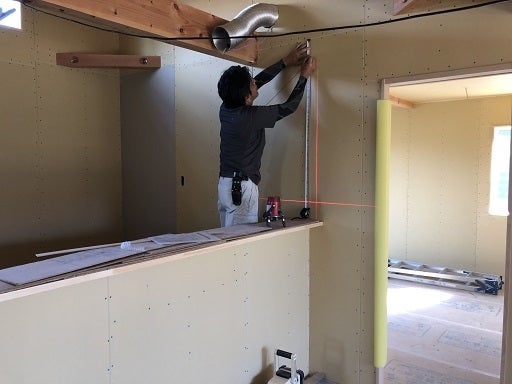 まずは、キッチンパネルの位置や換気扇の位置だしをし、施工を進めます。