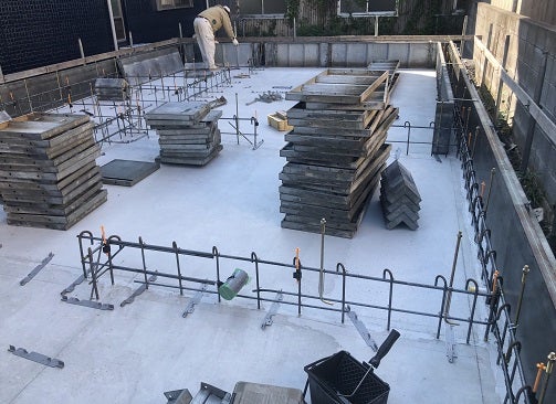 コンクリートの養生期間を終え昨日より型枠の撤去作業を開始しました。