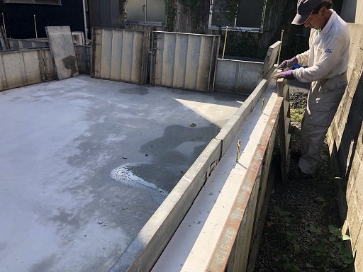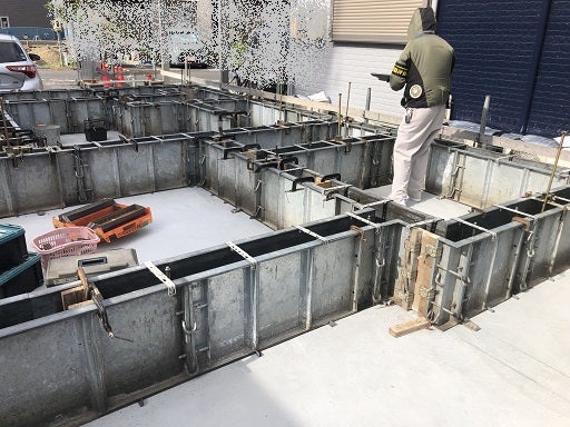 基礎工事は順調に進んでいます。耐圧盤のコンクリートを打設後立ち上がりの型枠組みを開始しました。
