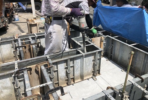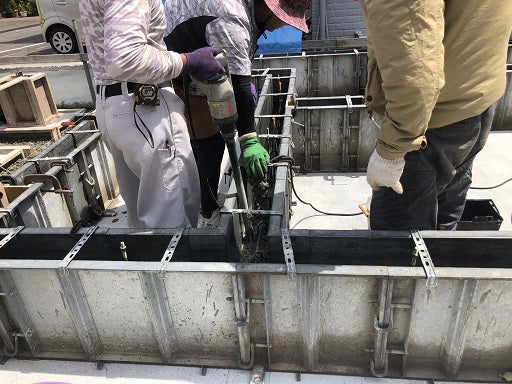 振動機を使いながら隅々までコンクリートを充填していきます。