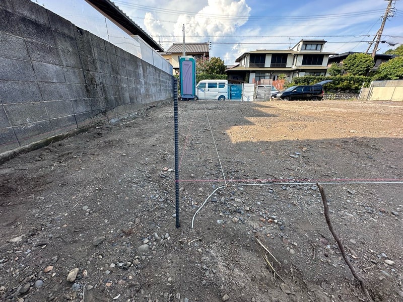 まずは基礎屋さんと敷地の境界や建物配置、設計GLについて現地で確認します。その後、掘り方の目安の位置に糸を張って土を地面を掘っていきます。
