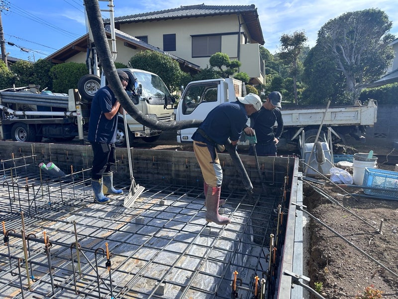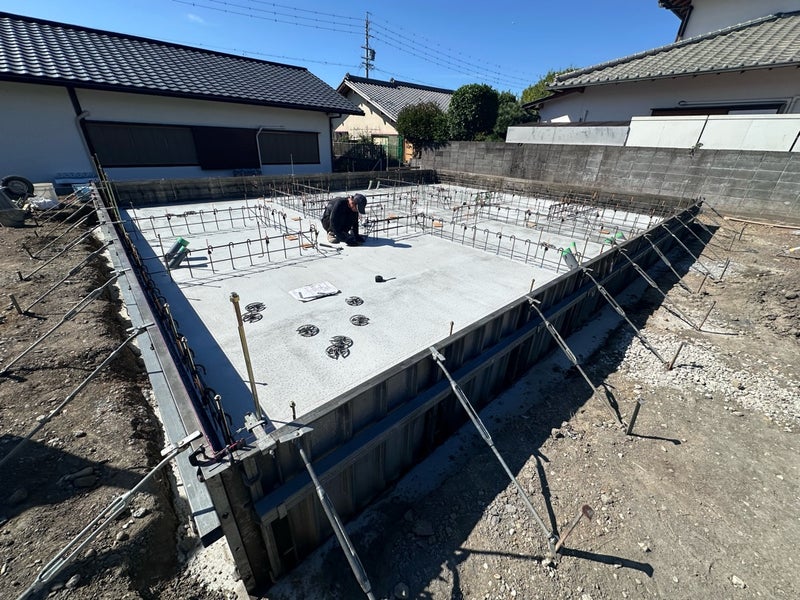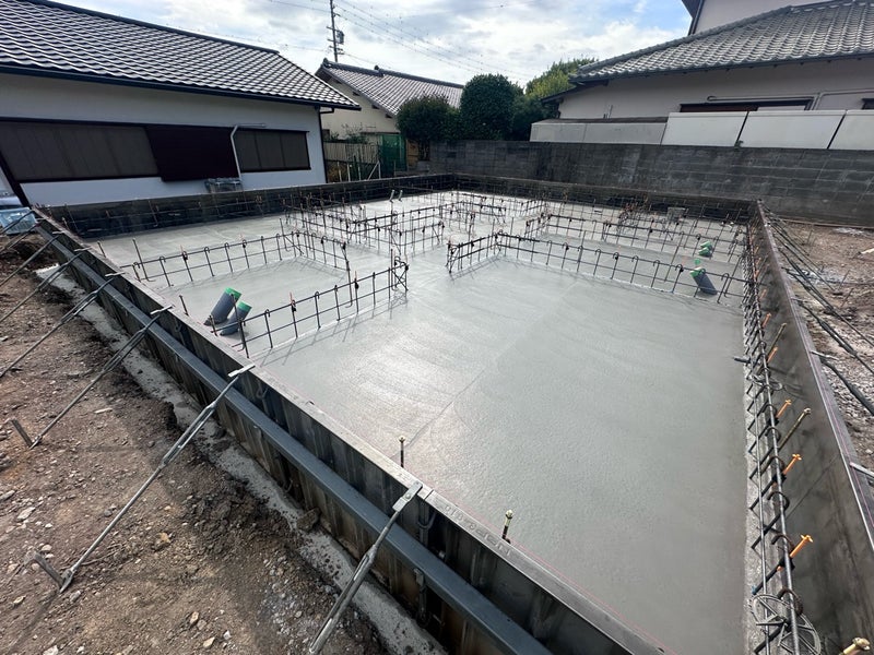 こんにちは!鎌田です。駿河区のO様邸です。今週スラブのコンクリート打設、立ち上がり部の型枠設置を行いました。