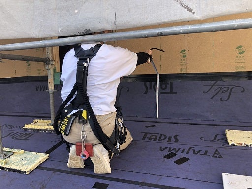 監査員さんがチェックリストと図面を手に確認していきます。ルーフィングの上下左右の重ね合わせ長さの確認、破れ等の確認、下屋根の壁取り合い部の立ち上がり寸法の確認、三面交点の止水処理の確認等行い合格となっております。