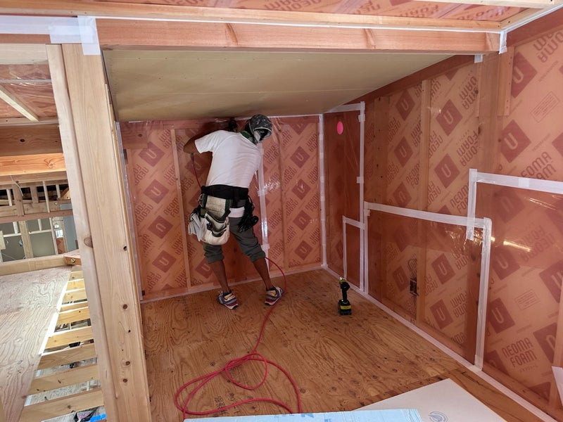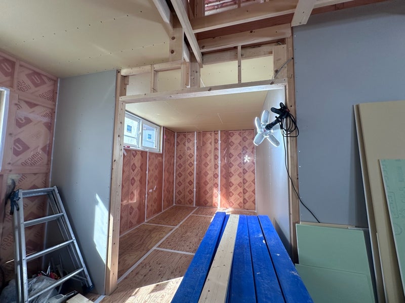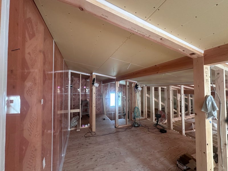 天井の下地組みが終わり、天井の石膏ボード貼りを行っています。石膏ボードを貼るときにはビスのピッチか広すぎないか、打ち忘れが無いかを気をつけながら作業しています。施工後には現場監督が責任を持って検査を行うのでご安心ください!