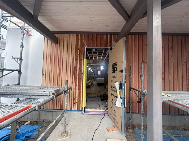 外部では、玄関前の杉羽目板の施工が終わりました。この後にノンロットのマホガニーレッドで塗装を行います。仕上がりがどんな風になるか楽しみにしていてください!