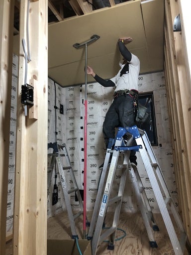 内部では棟梁が天井の下地工事を終えプラスターボード張りを進めています。