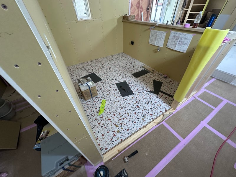 清水区でN様邸です。今週は水回りのクッションフロアやフロアタイルの施工、キッチンの取り付けを行いました。