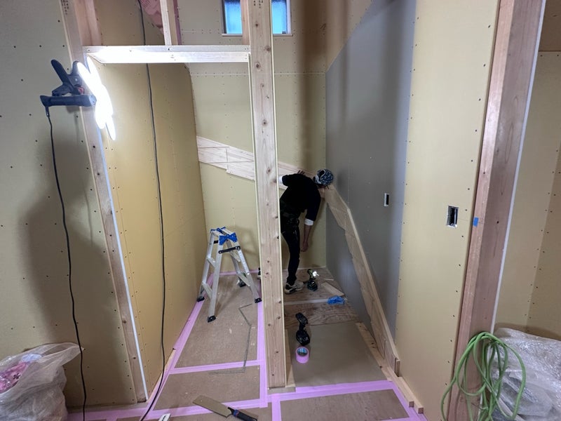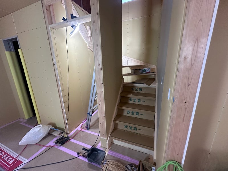 大工さんは階段の取り付け工事を行なっています。側板の寸法を何度も微調整してピッタリ収まるように丁寧に作業しています。もう少しで階段が完成するので次回のお打ち合わせ時には安全に2階の見学が出来ると思います。N様楽しみにしていてください!