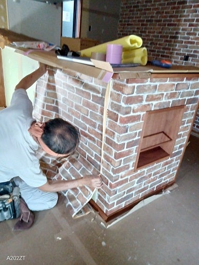 レンガ模様のクロスは貼り合わせ部分の柄を合わせながら丁寧に作業を進めていきます。