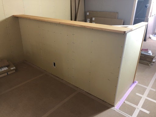 キッチンの施工を来週に控えキッチン前の腰壁の施工を進めました。配管の位置、電気配線の位置、キッチンの収まりを再度確認し進めていき、