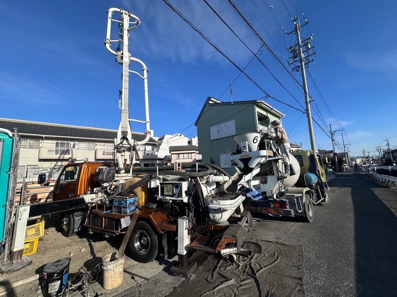 ミキサー車で運ばれてきた生コンクリートをポンプ車で圧送して型枠内に流し込んでいきます。生コンが指定された強度になっているか出荷伝票でしっかりと確認してから作業を行っています。