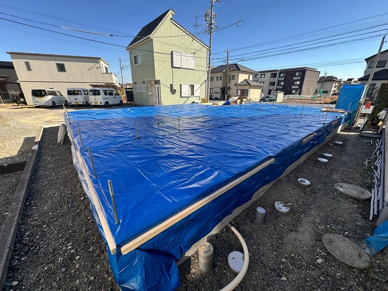 床合板を敷いて釘で固定、最後に汚れ防止のシートとブルーシートで養生をして土台伏せ完了です。この後は上棟用の材料搬入、足場設置をして上棟となります。上棟日までもう少しです。I様楽しみにしていてくださいね!