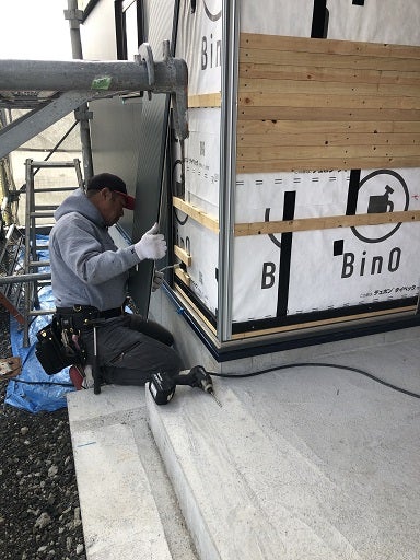 割り付けと方向等を確認し一枚ずつ張っています。この後、窓枠の取付と進め壁のプラスターボード張りを進めていく予定です。明日の現場打合せにて、T様にご覧頂くのを楽しみにしております。