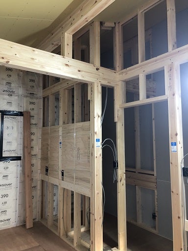 内部では棟梁が床板の施工完了後、間仕切りの壁のおこしと下地いれ工事を進めています。