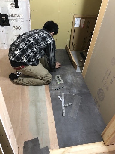 そして割り付けを考慮して一枚一枚張っていきます。とてもいい感じです。1階部分の洗面所やトイレ、ランドリー室も完了しています。