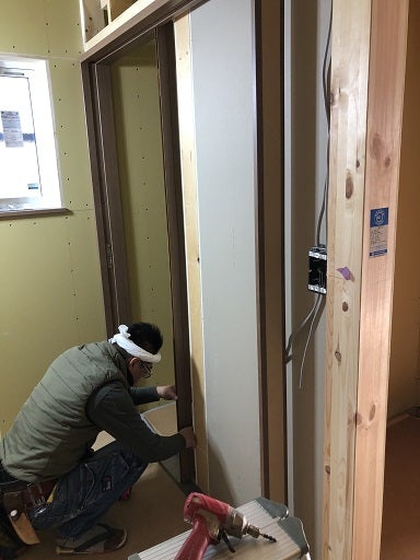 並行して棟梁は壁のプラスターボード張りを進めながら入り口枠の取付工事を進めています。