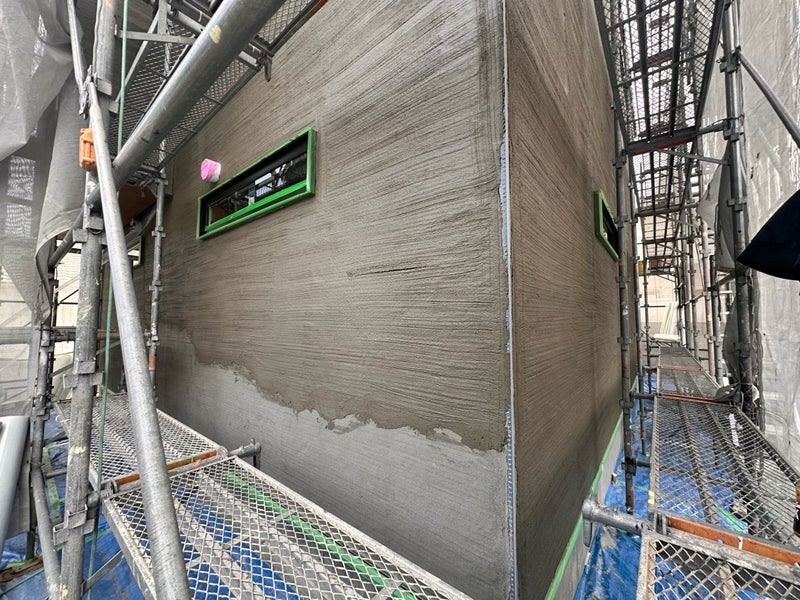 今週は中塗りまで施工し、モルタルが固まるまで約10日間の養生を行います。