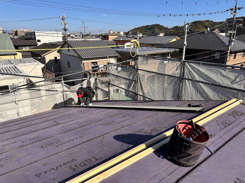 屋根板金の施工を行いました。工場で加工された屋根材を職人さんが一枚ずつ貼っていきます。