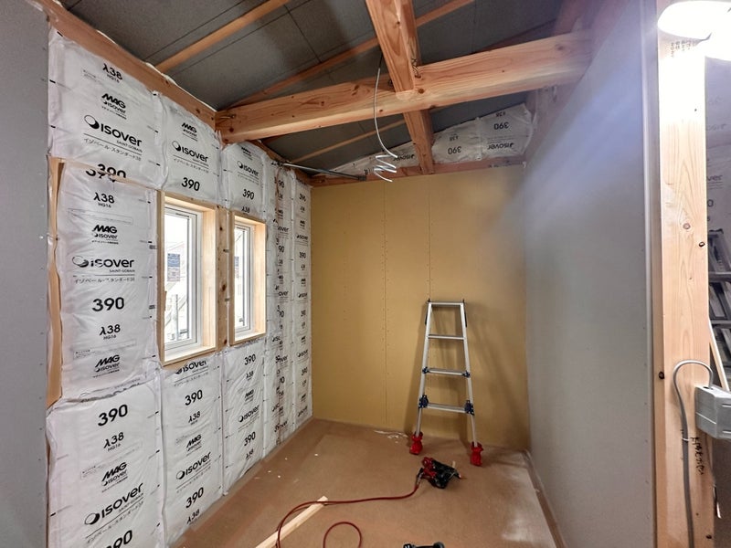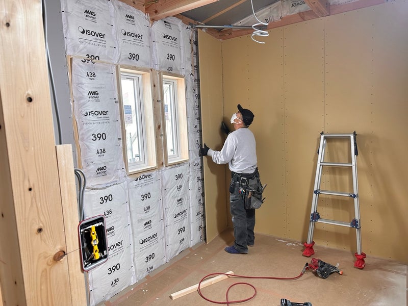断熱材の施工が終わり壁の石膏ボードの施工を行っています。石膏ボードを留め付けるビスの間隔にもしっかりと決まりがあります。施工後の社内検査で全てチェックするのでご安心ください!壁が出来上がってきたら天井の施工に進んでいきます。