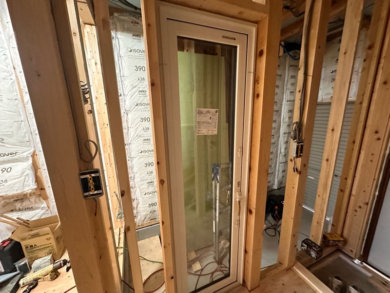 アウトドアストッカーと玄関をつなぐサッシも取り付け完了しています。