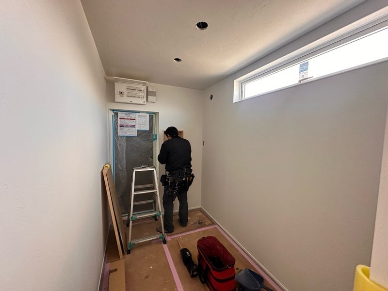 クロス工事も無事に完了し、設備機器の取り付けを行なっています。電機屋さんが照明器具やコンセント、スイッチを取り付け、水道屋さんがトイレや洗面器などを取り付けています。