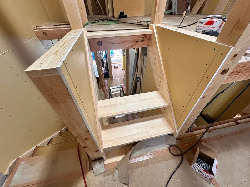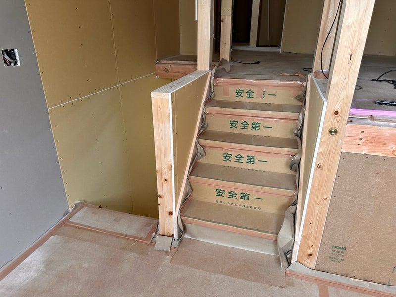 階段周りの壁のボード施工も完了しています。この後は1階廊下の天井ボード貼りを進めてインサイドストッカーの造作工事へと進んでいきます。