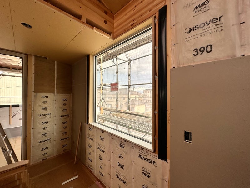 内部では、床のフローリングの施工が終わり、窓枠の取り付けを行っています。建具枠の取り付けまで終わったら壁のボード施工へと進んでいきます。
