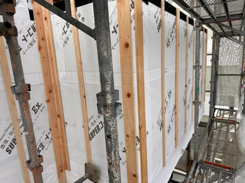 外部では外壁材の下地となる胴縁の施工を行なっています。今週中には胴縁の施工が終わり、来週から外壁材本体の施工へ進んで行く予定です。外壁が完成するまで2週間ほどです。どんな外観になるのか楽しみにしていてください!