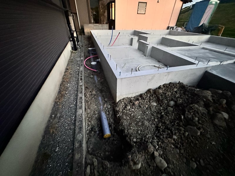 基礎工事のあとは床下と外周部に給配水管を施工していきます。