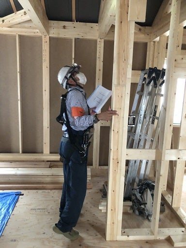 柱・梁の接続ピンの確認、火打ち梁のボルトの確認、床合板の釘の間隔の確認等を行い、