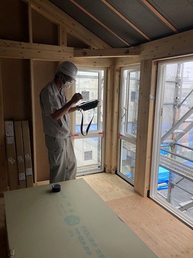 外部の耐力面材の施工及び柱脚、柱頭の接続金物等の主要構造部分の施工が完了したので、