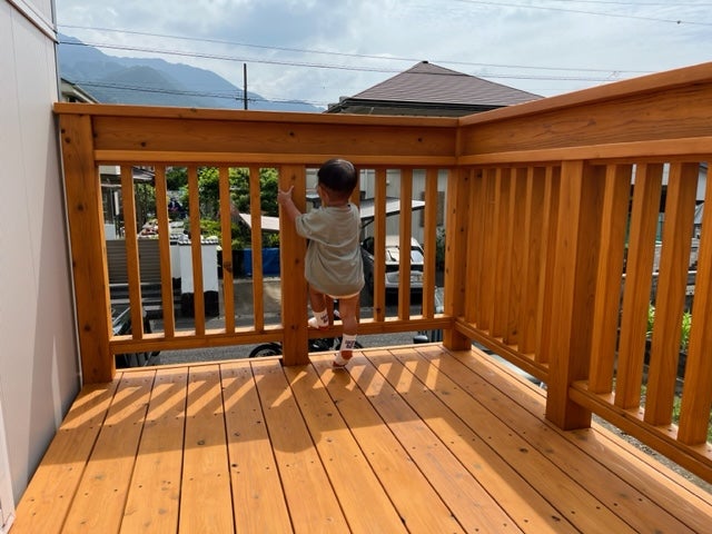 ナチュラルオーク色のデッキが映えます!(外構は7月中旬には完成予定です)