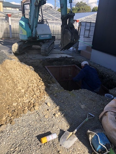 浄化槽の設置工事を進め、配管の接続工事、残っている雨水の配管工事を行いました。