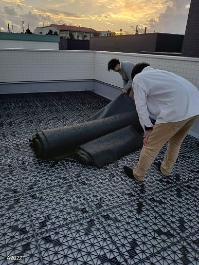 こちらは突風が吹くと飛んでしまうので、両面テープでしっかりと貼り付けます。屋上全体にひき詰めて完成しました(*^^)v