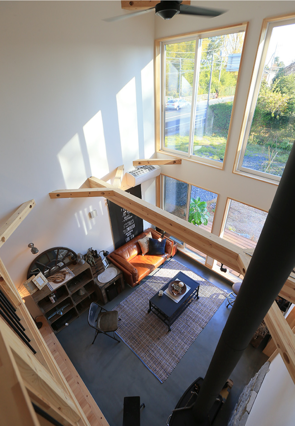大きな吹き抜けのある、開放感たっぷりのLDK。大窓に面した土間リビングが家の内と外とを緩やかにつなぎ、暮らしをもっと自由にします。