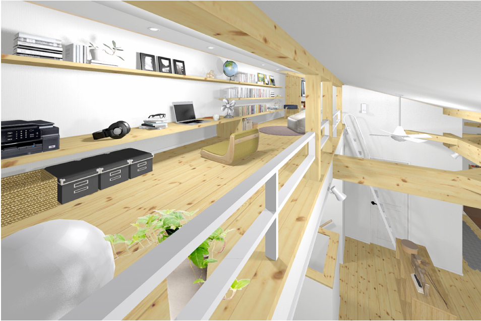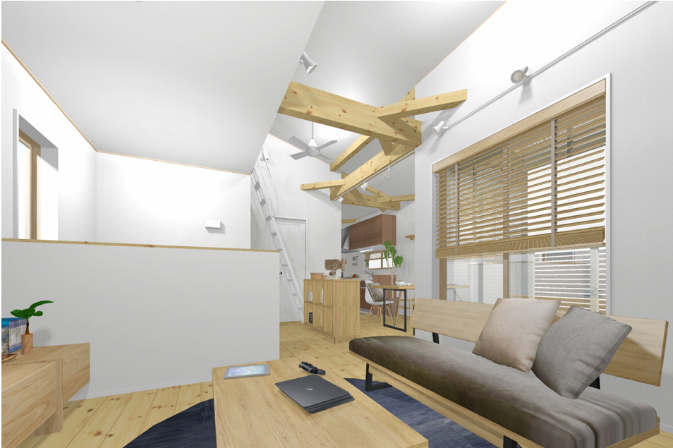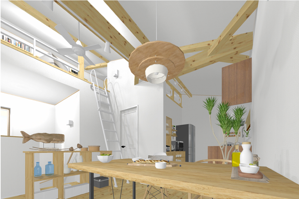 キッチン&ダイニングとリビングをゆるやかに仕切った2階。バルコニーと大きな窓でつながる空間は、家族でゆったり心地いい時間を過ごせます。吹き抜けには仕事や趣味に使える小屋裏が。