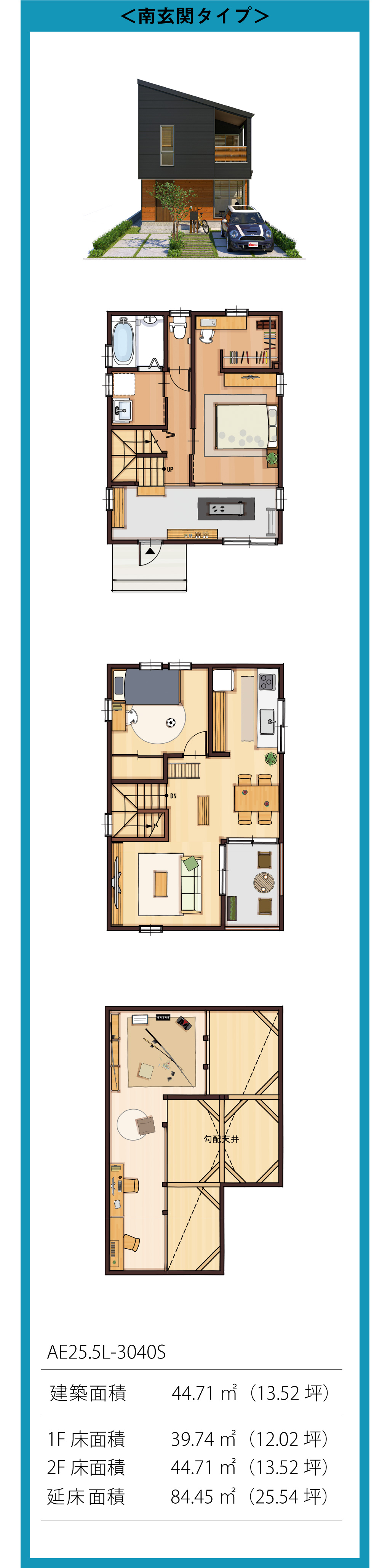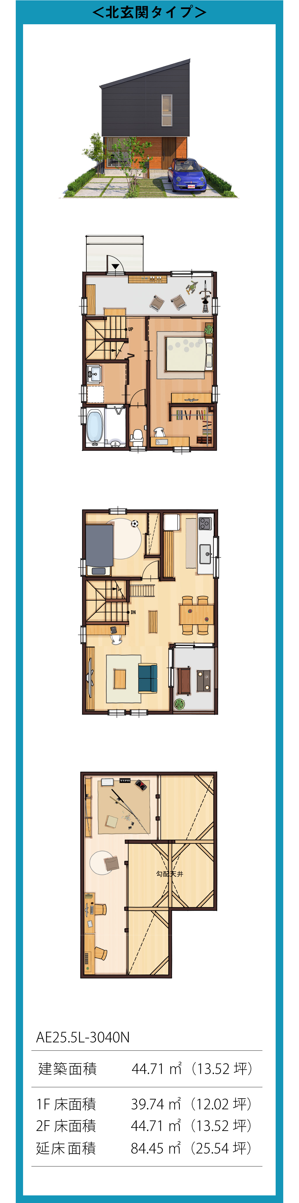 趣味や仕事に集中できる小屋裏スペース、のびのび体を動かせる土間空間、家族がゆったり団欒できるLDK&バルコニー。たった25坪だけど、毎日をとことん楽しめる仕掛けがいっぱいです。