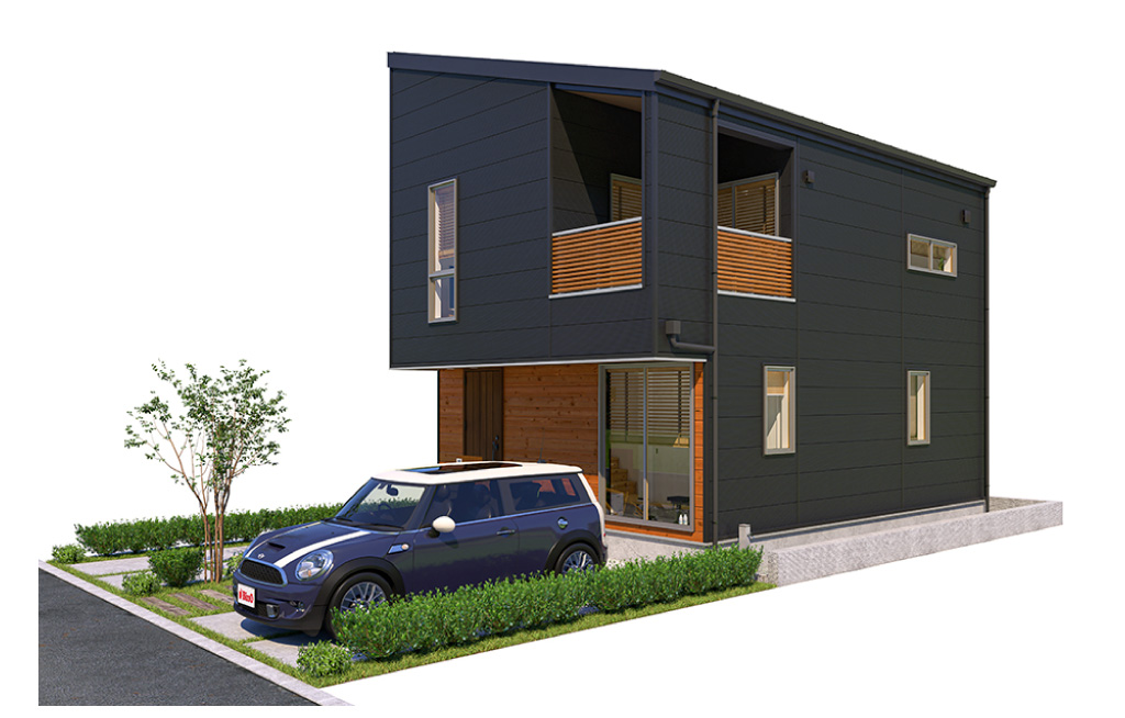 2階の一部を張り出したオーバーハングと片流れ屋根に個性が光るデザイン。1階の大きな窓は、玄関とつながる土間スペースにたっぷりと光をとりこみます。